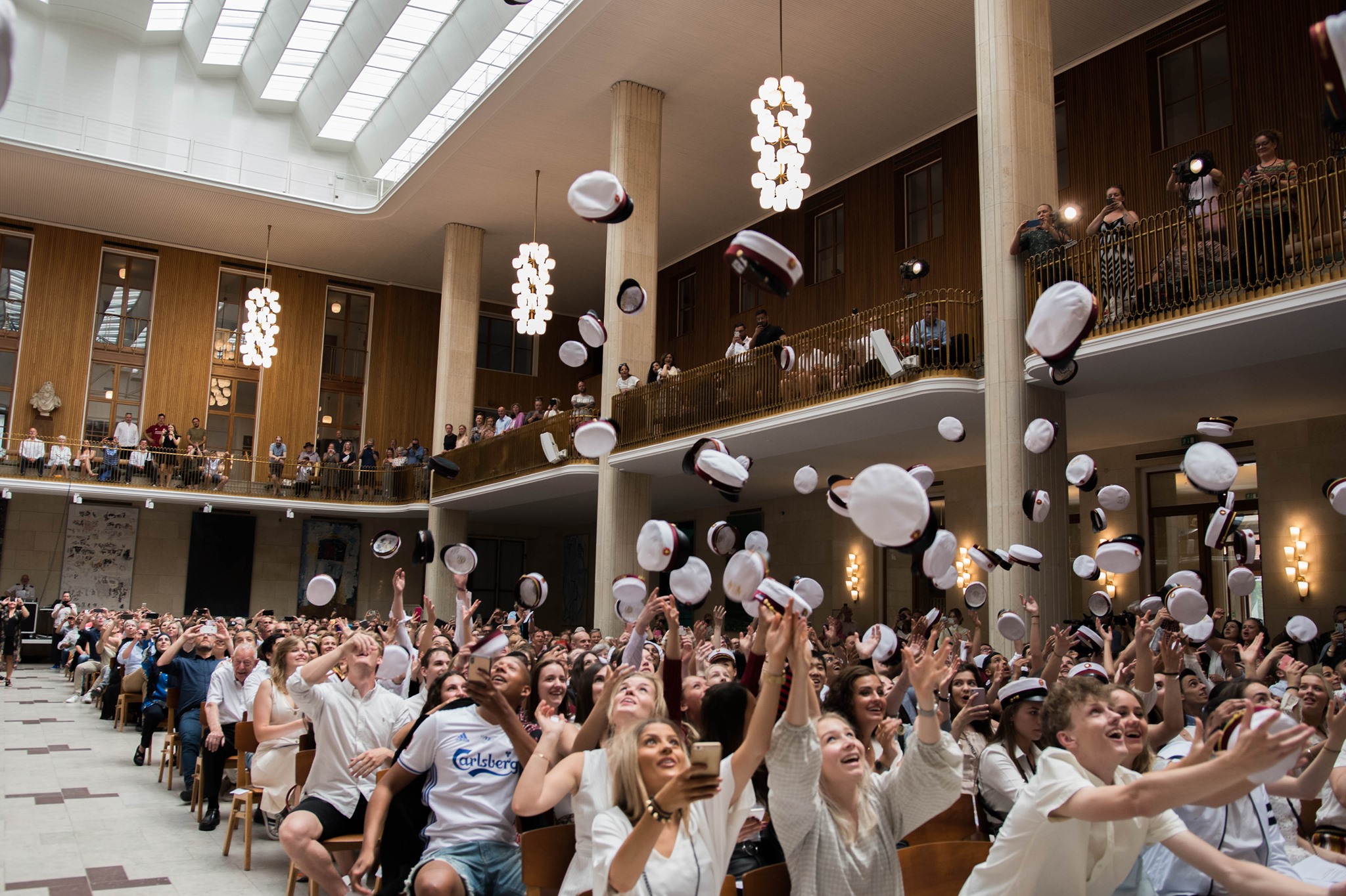 Foto af studenterne i Frederiksberg Rådhus festsal til translokation. De kaster studenterhuerne op i luften.